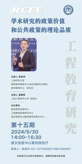 5月30日下午,中心邀请上海师范大学国际教师教育中心/联合国教科文组织、教师教育中心李廷洲研究员作题为“学术研究的政策价值和公共政策的理论品质”的讲座。讲座由副校长夏春明主持,工程教育发展研究中心顾问、华中科技大学教授、《高等工程教育研究》原执行副主编姜嘉乐,中心全体研究人员,教师教学发展中心、通识教育中心教师教学发展分中心教师代表和相关专业研究生出席讲座。