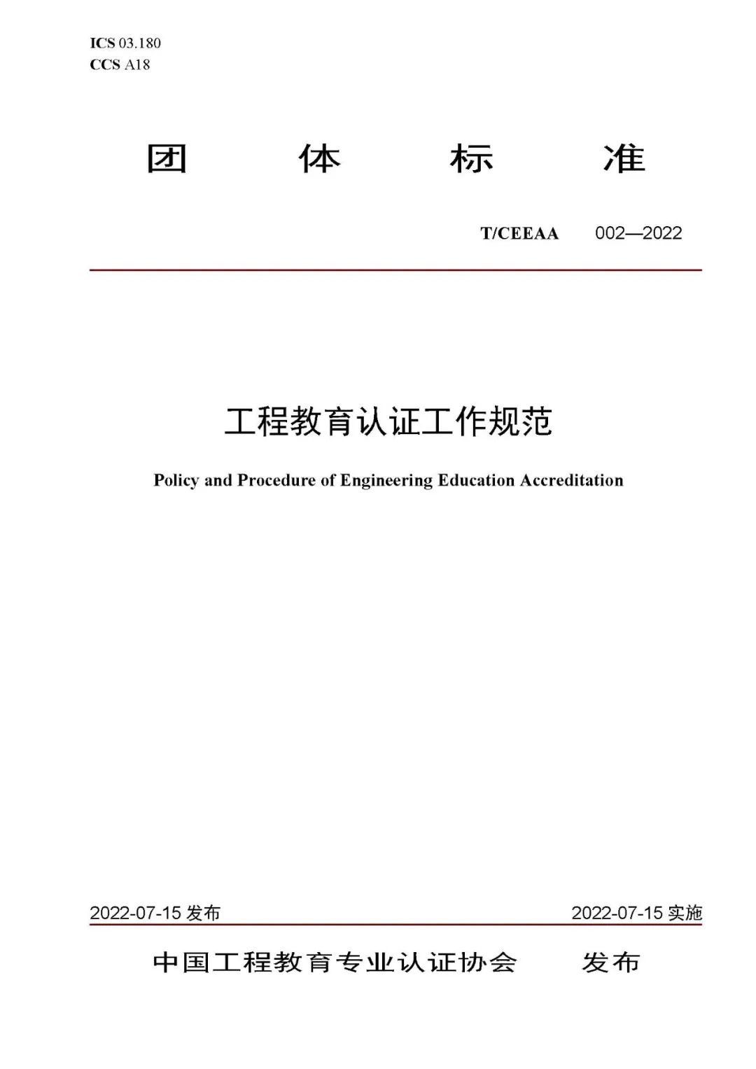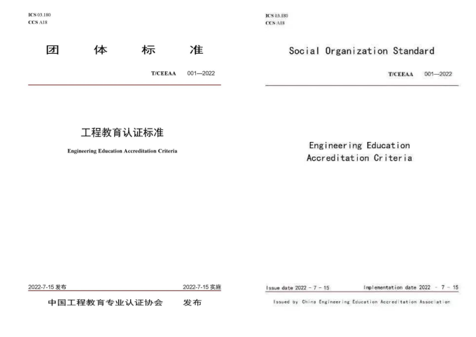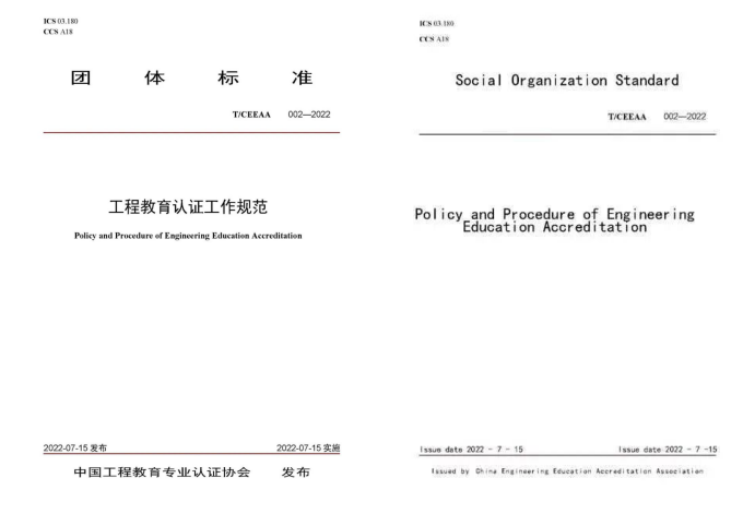 《工程教育认证标准》(T/CEEAA 001-2022)《工程教育认证工作规范》(T/CEEAA 002-2022)团体标准(中文版、英文版),由中国工程教育专业认证协会、教育部教育质量评估中心、中国标准化协会等58家单位共同起草,于2022年7月15日正式发布,国际标准分类号03.180,中国标准分类号A18。两项团体标准均适用于普通高等学校全日制普通四年制本科专业工程教育认证,其中《工程教育认证标准》主要规定了工程教育认证的通用要求和各专业类补充要求,《工程教育认证工作规范》规定了开展工程教育认证工作的认证程序、监督与仲裁,以及相关的回避、保密和其它纪律要求。