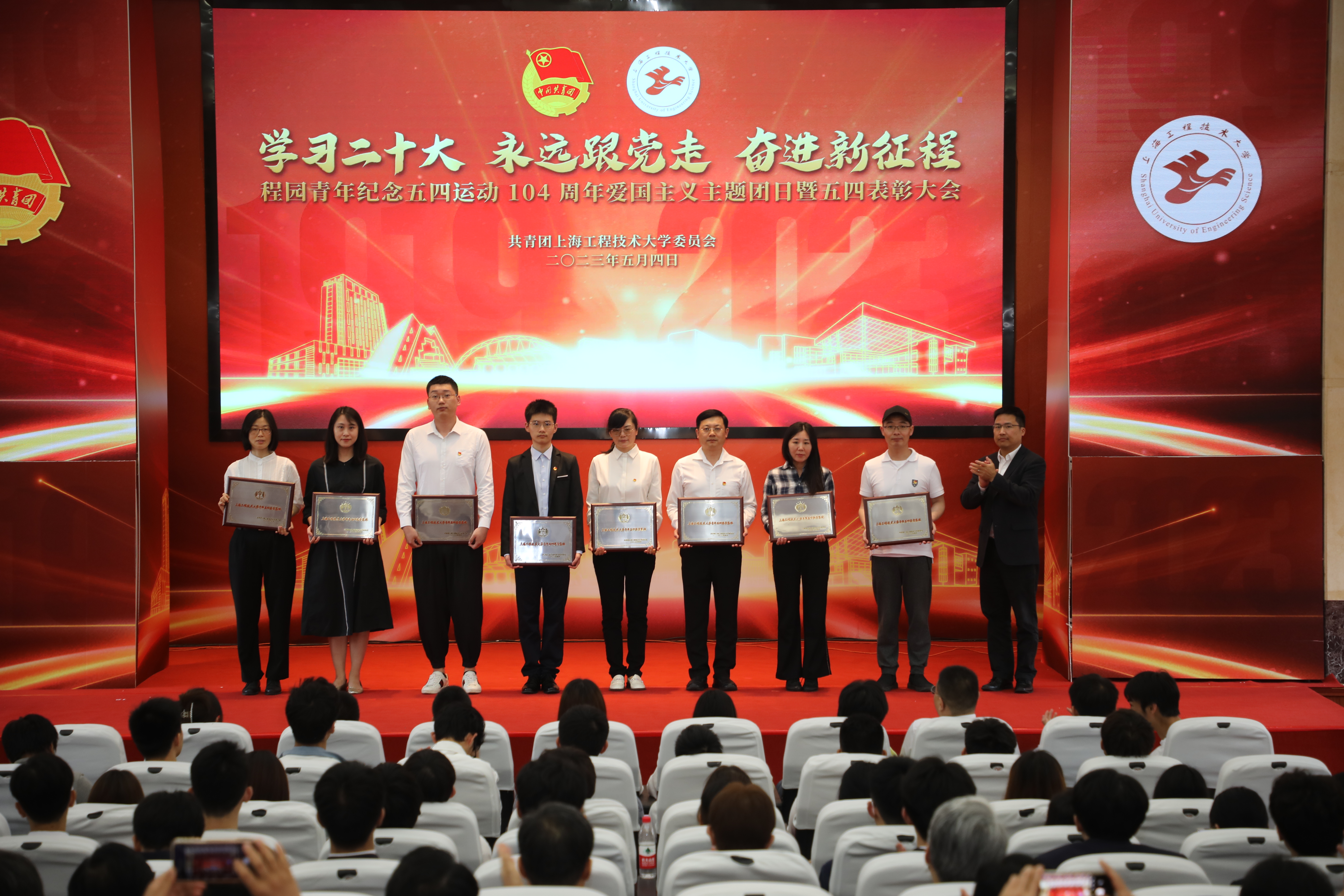 5月4日,“学习二十大 永远跟党走 奋进新征程”程园青年纪念五四运动104周年爱国主义主题团日暨五四表彰大会于在行政楼B301召开。校领导、学校相关职能部处负责人,各二级学院党委书记、副书记,程园青年代表共计200余人在现场参会,万余人次通过“工程大青年”B站直播在线观看。中心毛智伟老师代表中心领取“上海工程技术大学青年五四奖章集体”荣誉奖牌。